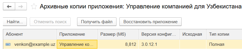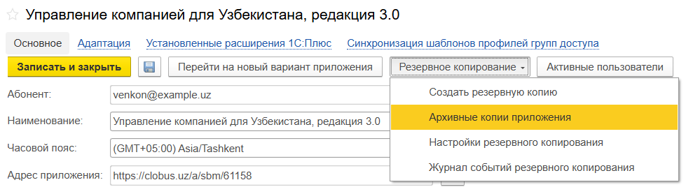 Выбрать в карточке приложения команду Резервное копирование — Архивные копии приложений.