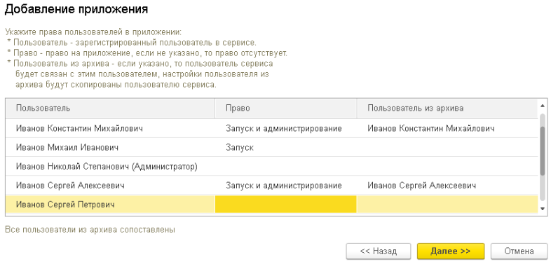 После того, как все права и сопоставления указаны, следует нажать кнопку Далее >>.