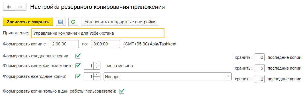 В открывшемся окне Настройка резервного копирования приложения установите параметры расписания, по которому будет проводиться резервное копирование в сервисе.
