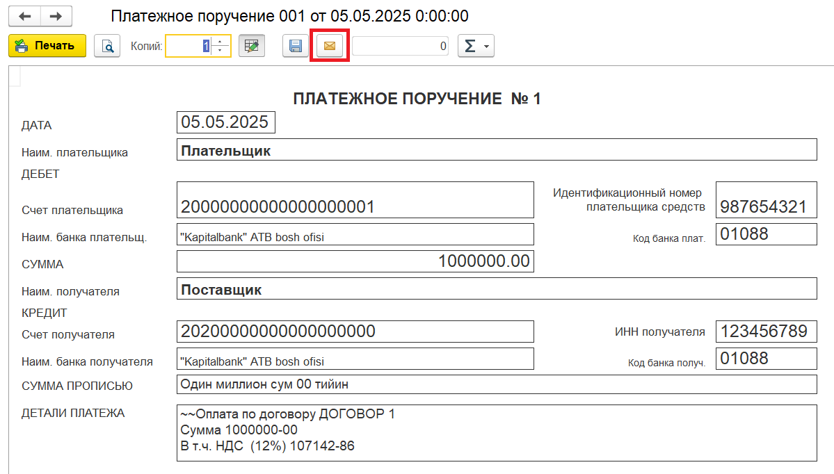 Например, при работе с «1С:Бухгалтерией 8» для отправки документа по электронной почте нужно в форме подготовки документа для печати нажать кнопку с изображением почтового конверта: :