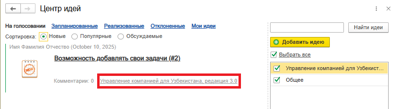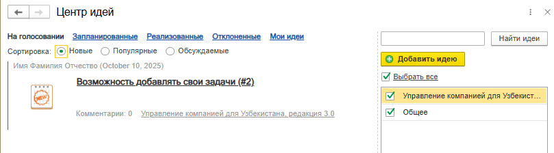 После нажатия ссылки Центр идей выводится список зарегистрированных идей: