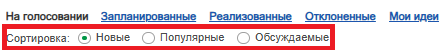 установить порядок сортировки списка идей, нажимая пункты переключателя Сортировка: