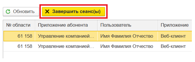 Нажать кнопку Завершить сеанс(ы) над таблицей Активные пользователи.