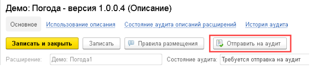 Описание расширения можно отправить на аудит также из формы описания расширения: