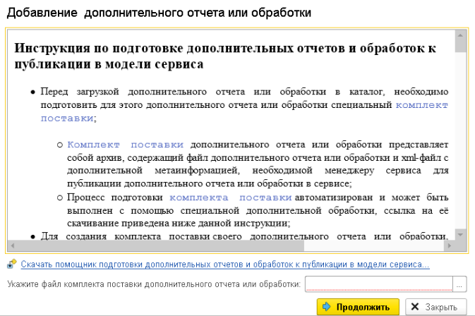 В поле Укажите файл комплекта поставки дополнительного отчета или обработки следует выбрать заранее подготовленный zip-файл комплекта поставки дополнительного отчета или обработки. Затем необходимо нажать кнопку Продолжить.