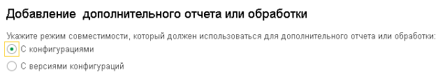 С версиями конфигураций — в этом режиме дополнительный отчет или обработка будет блокироваться при каждом обновлении конфигурации, для которой он будет использоваться. Разработчик должен будет протестировать совместимость с новой версией конфигурации, после чего: