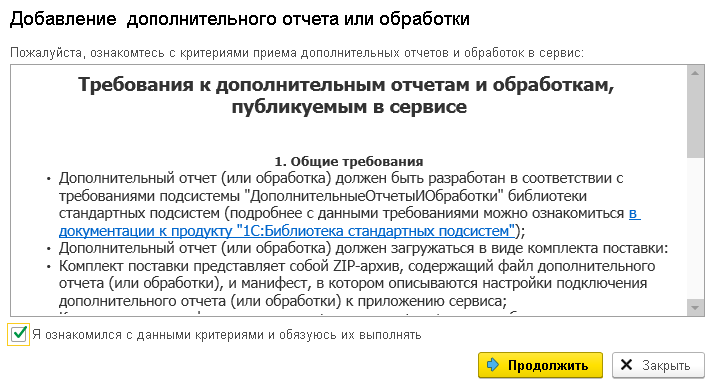 Будет выведено окно мастера добавления дополнительных отчетов и обработок. На первом шаге мастера разработчику могут быть продемонстрированы критерии приема дополнительных отчетов и обработок в каталог.