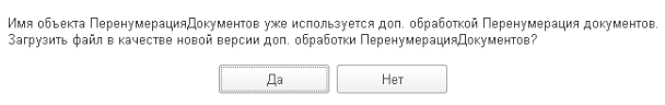 Если наименование дополнительного отчета или обработки совпадает с уже имеющимся, мастер спросит, будет ли загружаться новая версия имеющегося дополнительного отчета или обработки. Если будет загружаться новая версия, следует ответить Да.