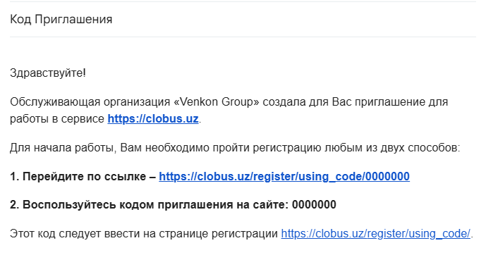На адрес электронной почты, указанный в окне Приглашение для регистрации (создание) будет направлено электронное письмо с темой Код приглашения. Вот примерный текст этого письма: