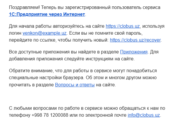 В письме указывается, какой абонент вас добавил в качестве пользователя абонента, назначенная вам роль по отношению к этому абоненту и к каким приложениям этого абонента вы получили доступ.