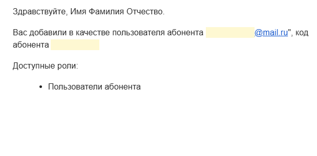 Если вы уже являлись пользователем сервиса, то после добавления вас в качестве пользователя абонента вы получите электронное письмо. Тема письма Добавление к абоненту: