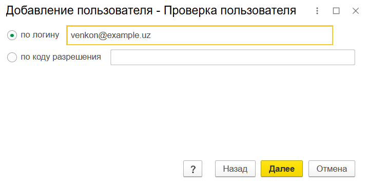 При выборе режима добавления по логину в следующей форме нужно будет указать зарегистрированный в сервисе адрес электронной почты разработчика и нажать кнопку Далее >>.