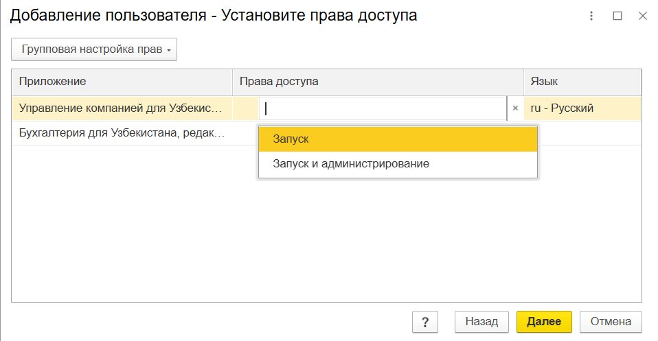 Далее мастер добавления пользователя попросит указать права нового пользователя (разработчика) по отношению к приложениям абонента: