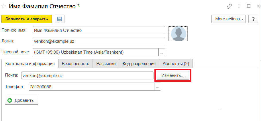 В выведенном окне персональных данных пользователя нажать кнопку Изменить... на вкладке Контактная информация.