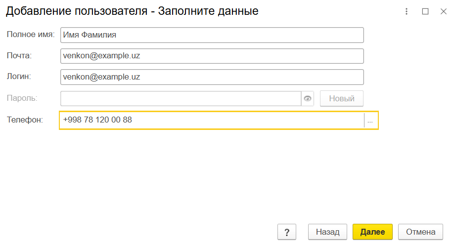 Если пользователь ранее не был зарегистрирован в сервисе, задайте поля: