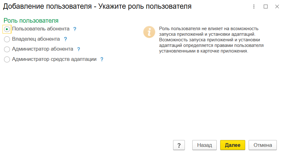 Если пользователя абонента добавляет Владелец абонента, то необходимо указать роль добавляемого пользователя по отношению к абоненту:
