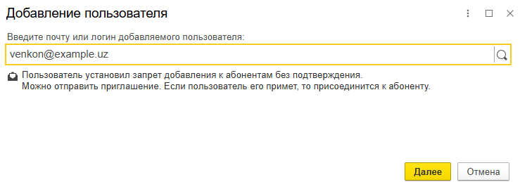 При попытке добавить к абоненту пользователя, который установил запрет добавления к абонентам без подтверждения, Владелец или Администратор абонента увидят следующее уведомление: