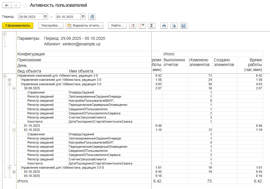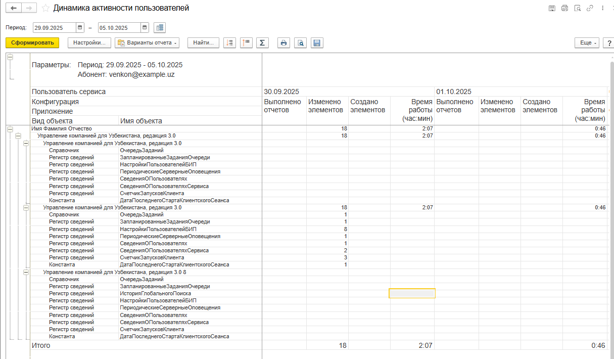 В отчете Активность пользователей выводятся сведения об использовании пользователями абонента конфигураций, приложений и объектов приложений (документов, отчетов, справочников, регистров сведений и т. п.), за каждый день периода отчета.