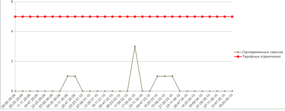 При выборе варианта отчета Диаграмма будет выведен график или показана гистограмма количества сеансов пользователей абонента. Красной линией будет отображено тарифное ограничение.
