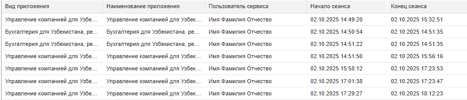 В отчете Сеансы пользователей содержатся сведения о сеансах работы следующих пользователей.