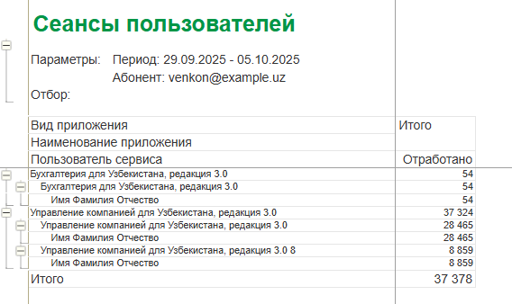 В столбцах отчета для каждого пользователя абонента, работавшего в сервисе, указано: