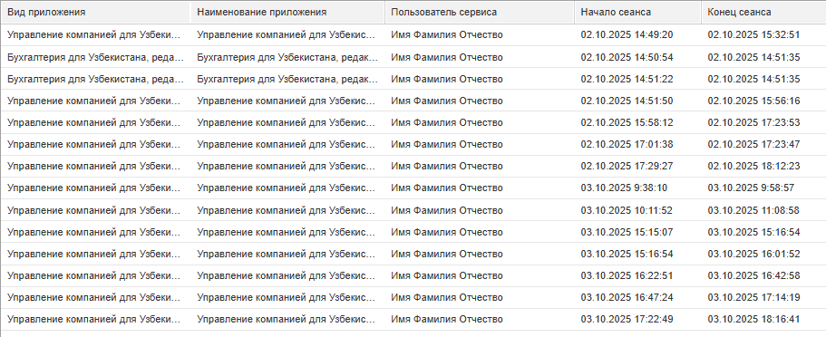 При необходимости, указав условия в строках Конфигурация, Наименование приложения или Пользователь сервиса, можно ограничить отчет сеансами, относящимися к конкретной конфигурации, приложению или пользователю.