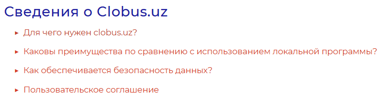 На сайте сервиса clobus.uz имеется справочная система, состоящая из статей (публикаций) по различным вопросам работы с сервисом и его приложениями. Справочная система доступна всем пользователям, как зарегистрированным, так и анонимным.